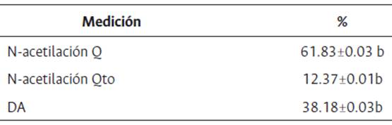 Tabla 1: Resultados de los porcentajes de N-acetilación para quitina (Q) y quitosano (Qto), y el grado de acetilación (%DA)