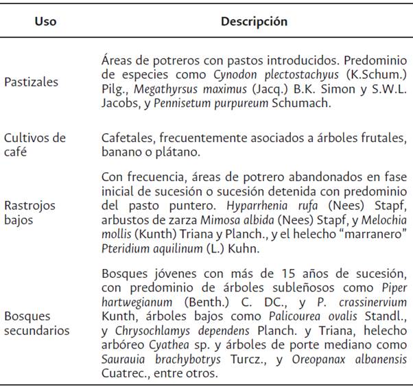 Tabla 1: Descripción general de las principales coberturas vegetales estudiadas en la zona de reserva de la reserva cuenca del río Cali