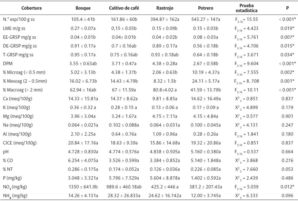 Datos (media ± desviación entre coberturas mediante estándar n = 5), seguidos por letras diferentes son significativamente diferentes (p < 0.05) entre valores p de la misma variable prueba de Tukey