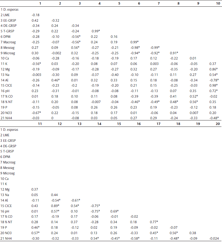 Diferentes estudios han mostrado que los HMA, al igual que otras micorrizas, son agentes importantes en la absorción de nutrientes por las plantas, al incrementar la superficie de contacto de sus raíces, y contribuyen en la estructuración física del suelo formando agregados estables (Cardoso y Kuyper, 2006; Rillig y Mummey, 2006; Delavaux et al., 2017). En el análisis de correlaciones Pearson, la glomalina fácilmente extractable (EE-GRSP) presentó una relación negativa estadísticamente significativa con el índice de estabilidad de agregados DPM y el porcentaje de macroagregados, y una relación positiva con el porcentaje de mesoagregados (Tabla 3). La mayor longitud de micelio externo (LME) y de dos variables glomalina (T-GRSP, DE-GRSP) en los suelos de bosque y rastrojo puede relacionarse con los altos índices de agregación, ya que esta proteína secretada durante el desarrollo de las hifas aglutina las partículas de suelo en forma de cadenas de pequeñas bolsas pegajosas (Stíckíng string bags) (Cardoso y Kuyper, 2006; Rillig y Steinberg, 2002). Por las características insolubles de la glomalina, la materia orgánica contenida atrapada en los agregados queda protegida del efecto erosivo y de la degradación bacteriana (Cardoso y Kuyper, 2006). Los HMA juegan un papel importante en la estructura del suelo y en el desempeño de las plantas. Con el incremento del micelio externo se incrementa la superficie de absorción de nutrientes y, a su vez, como efecto simbiótico, el aumento del flujo de carbono de la planta a los HMA puede también explicar el incremento de la longitud del micelio externo (Delavaux et al., 2017), es decir, es un sistema que se retroalimenta, y también es modulado por la actividad de micro y macroorganismos del suelo (Lavelle et al., 2020).