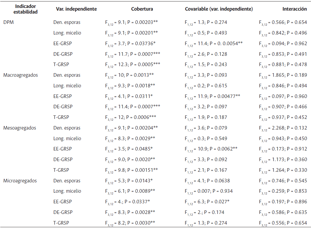 Tabla 4: Efecto de las variables indicadoras de estabilidad: diámetro ponderado medio (DPM), porcentaje de macroagregados, mesoagregados y microagregados, con respecto a las covariables de rasgos de micorrizas