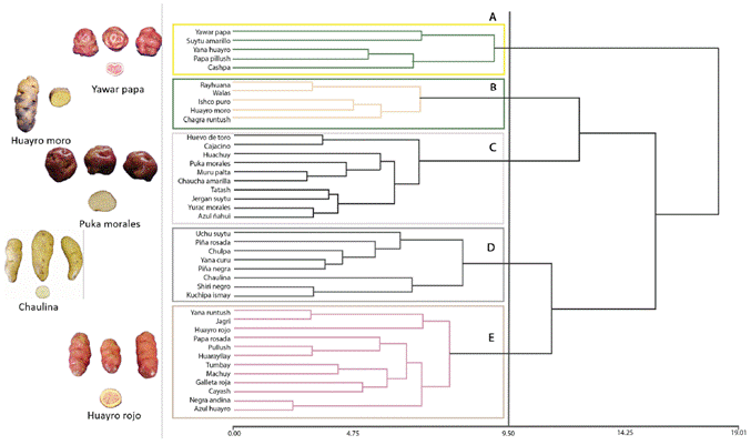 Figure 1: Dendrogram of 40 native potato landraces of the Pasco region based on 20 morphological descriptors and using the UPGMA method (Ward’s aggregation criterion). The tuber images on the left side are representative of each group.