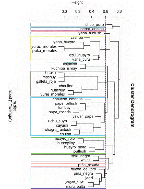 Seven groups of native potatoes related at molecular level were identified. The first formed by Cashpa, Yana huayro, Yurac morales, Puka morales, Azul huayro, and Yana curu. In the second group, Cajacino and Kuchipa ismay were observed. In the third group, six landraces were observed: Tatash, Machuy, Galleta roja, Chaulina, Huachuy, and Suytu amarillo. In the fourth group were Chaucha amarilla, Papa pillush, Tumbay, Papa rosada, Yawar papa, Uchu suytu, Cayash, Chagra runtush, and Chulpa. The fifth group was formed by Huayro rojo, Huarayllay, Huayro moro, and Pullush. In the sixth group were Shiri negro and Walas; and in the seventh group, Huevo de toro, Piña negra, Jagri, Jergan suytu, and Muru palta.