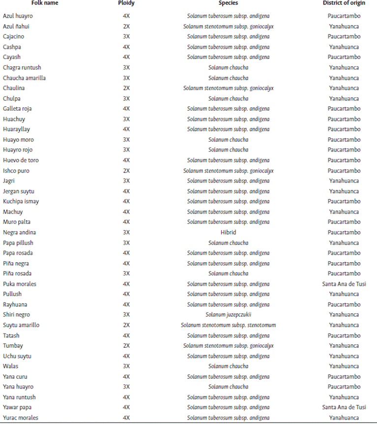 - De la Cruz, G.; Miranda, T. Y.; Blas, R. H.; Neyra, E. and Orjeda, G. (2020). Simple sequence repeat-based genetic diversity and analysis of molecular variance among on-farm native potato landraces from the influence zone of Camisea Gas Project, northern Ayacucho, Peru. American Journal of Potato Research, 97(2), 143-161. https://link.springer.com/article/10.1007/s12230-020-09763-7 [URL] 🠔