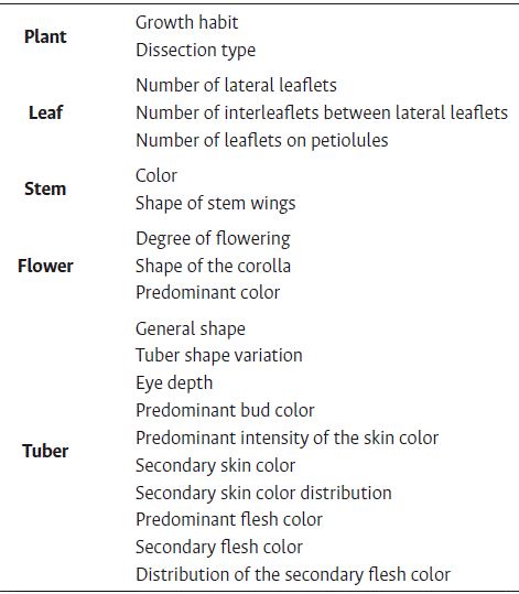 The first description of the selected landraces was made in the greenhouse when the potato plants were in full bloom and after harvest, following Gómez (2000). The 20 qualitative descriptors considered are detailed in Table 2.