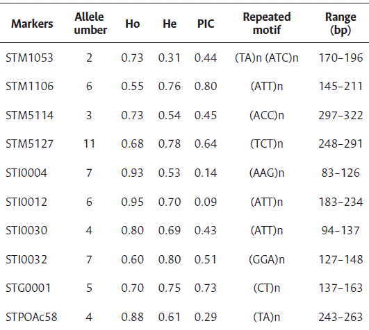 The highest and lowest expected heterozygosity values were expressed by the markers STI0032 (0.795) and STM1053 (0.313), respectively (Table 3). It is considered that the most informative markers were those that presented a positive value when subtracting the expected heterozygosity from the observed one, being the following: STG001, STM1106, ST0032 and STM5127. The lowest PIC value (0.14) was obtained with the marker STI0004, and the highest PIC value (0.80) was obtained with the marker STM1106.