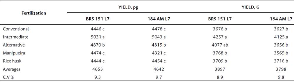 Table 5: Average values of pod (YIELD, pg), and grain (YIELD, G) yield of peanuts BRS 151 L-7 and 184 AM L-7 produced in the Roraima Cerrado, considering different fertilizations
