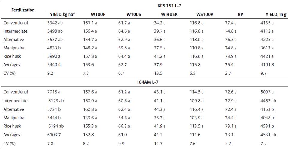 In cv. BRS Sertaneja rice cultivation there was a significant interaction between the plantations as a function of conventional fertilization. The first planting stands out when compared to the second one (Table 2), the latter showing a maximum yield value of 4.815 kg ha-1 with an increase of 20.70 % in yield when compared to the first planting. In addition, intermediate fertilization in the second planting also obtained a gain of 20.17 % when compared to the first one. It should be noted that, in the second planting, alternative fertilization and rice husk were superior when compared to the first planting (Table 2).