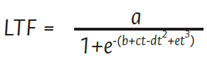 donde LTF es la longitud de tallo en cm según el tiempo (t); a es el valor máximo de la variable en el tiempo en cm; b, c, d y e son constantes relacionadas con la velocidad relativa de crecimiento (VRC) y los puntos de inflexión de la curva de crecimiento. La VRC se calculó con la ecuación (2) , al derivar la fórmula de LTF.