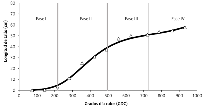 La VRC alcanzó los máximos valores a los 353 GDC (34 ddp) con 0.148 cm día-1 (Figura 2). A partir de este momento, la VRC disminuyó rápidamente hasta los 721 GDC (69 ddp), instante en el que inicia el estadio “garbanzo”, y comienza una etapa de muy bajo crecimiento en la LTF hasta los 787 GDC (estadio fenológico de “rayando color”), punto en el cual nuevamente se acelera el crecimiento en la altura del tallo hasta el punto de corte (923 GDC).