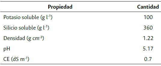 El manejo del cultivo se llevó a cabo con la instalación del fertirriego por goteo (pH = 6.1), en el cual se suministraron todos los macro y micronutrientes para las plantas de rosa, como son nitrógeno (N), fósforo (P), potasio (K+), calcio (Ca2+), magnesio (Mg2+), azufre (S), hierro (Fe), zinc (Zn), boro (B), manganeso (Mn) y cobre (Cu). Las aplicaciones de Si se realizaron justo después del pinch (corte de yema apical para eliminar dominancia y permitir el desarrollo de tallos laterales) con un fertilizante a base de Si y K (Tabla 1). Para el tratamiento de fertirriego se utilizó una dosis de 0.33 ml/l. En el tratamiento vía foliar, se asperjó una dosis de 1.5 ml/l del mismo compuesto. Para la aplicación de Si al sustrato y vía foliar se manejaron las mismas concentraciones mencionadas anteriormente. Las aplicaciones se realizaron a los 7, 14, 28, 42, 56 y 70 días después del pinch (ddp).