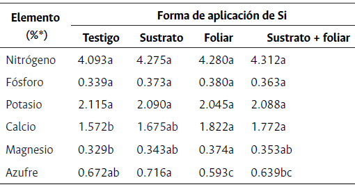 Tabla 2: Concentraciones foliares de macronutrientes en plantas de rosa hidropónica “Snowflake” en el estado fenológico “rayando color” bajo diferentes métodos de aplicación de Si