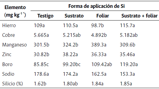 La aplicación de Si no aumentó la concentración de Fe ni de Cu en las plantas de rosa. Por el contrario, la aplicación foliar de Si disminuyó estas concentraciones en un 9.44 % y 13.63 %, respectivamente. A pesar de que el Si foliar redujo el Fe y Cu, los valores de estos elementos estuvieron dentro del rango normal recomendado y no alcanzaron valores de deficiencia (Tabla 2).