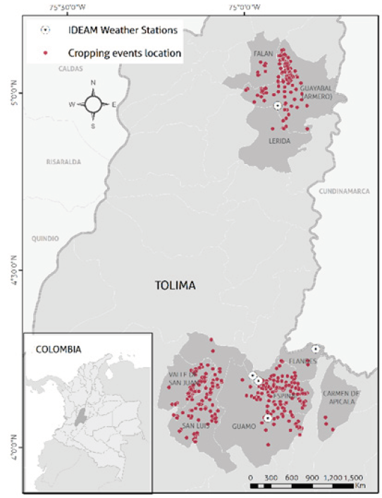 This study focuses on the maize producing region of the Tolima department (Figure 1), which concentrates 15% of the total maize production in Colombia (MADR, 2017). Taking as reference the meteorological station Nataima located in the municipality of Espinal-Tolima (IDEAM), the maximum and minimum daily temperatures have average values of 33°C and 22°C, respectively. There are two rainy seasons between March-May and September-November, which determine the sowing seasons. Solar radiation has values between16 MJ m-2day-1 and 21 MJ m-2day-1.