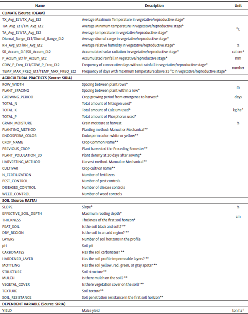 The aim of this study was to pinpoint the climate, soil, and management variables influencing maize yield fluctuations, based on information obtained from farmers productive experiences in Tolima, a region renowned for its significant maize production in Colombia.