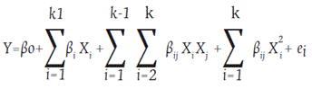 Dónde: Y: variable respuesta o dependiente; Xi: variables independientes; β0: intercepto; βi, βij, βii: coeficientes de regresión para términos lineales, cuadráticos e interacciones; k: número de variables.