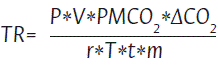 Dónde: P: presión atmosférica (atm), V: volumen del espacio libre (V = Vrecipiente - Vfruto); PMCO2: peso molecular del CO2; : diferencia entre el porcentaje de CO2 producido durante 1 hora; r: constante de los gases (0,082 atm. L/K); T: temperatura de almacenamiento; t: tiempo de medición (1 h); m: masa de la muestra.