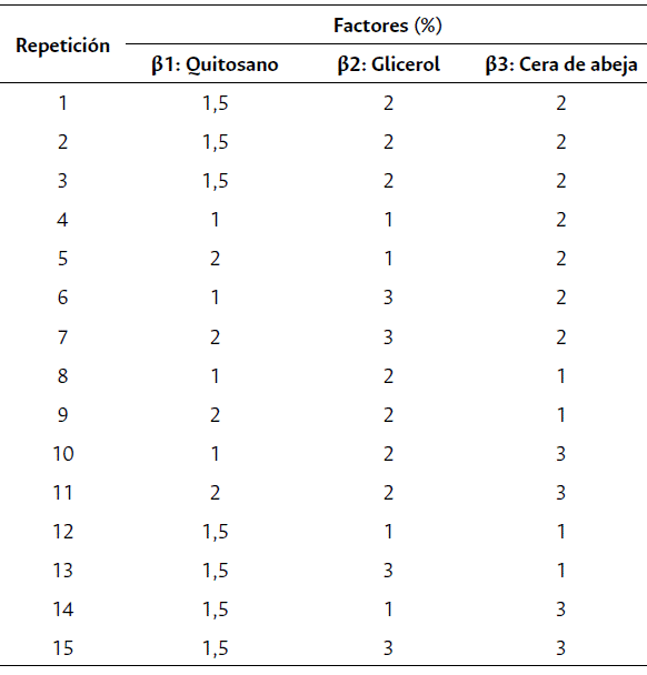 Se utilizó un diseño Box-Behnken de tres factores cada uno, con tres niveles y tres réplicas en puntos centrales, para un total de 15 repeticiones. Se utilizaron formulaciones con tres variables independientes, incluidos quitosano (β1): 1,0-2,0 %, glicerol (β2):1,0-3,0 %, y cera de abeja (β3):1,0-3,0 %, para obtener combinaciones óptimas (Tabla 1). Los niveles de estas variables independientes se seleccionaron de pruebas preliminares. El diseño experimental, el modelo de regresión y el análisis estadístico se realizaron con el software Design- Expert 11. Los datos experimentales se ajustaron con la siguiente ecuación polinomial de segundo orden: