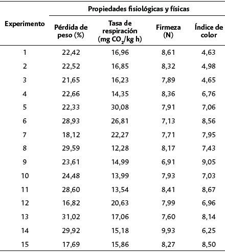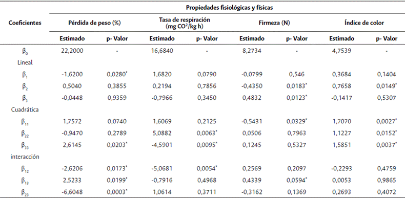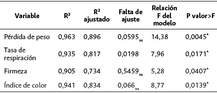 Los datos experimentales (Tabla 2) permitieron determinar coeficientes de determinación R2, R2 ajustado y el valor P (Tabla 3). Los valores R2 y R2 ajustado fueron altos, entre 0,905 y 0,941; esto mostró la relación entre el modelo y los datos experimentales. Los valores de falta de ajuste no fueron significativos excepto para la variable respuesta de tasa de respiración (p < 0,05) confirmando que el modelo describe adecuadamente la superficie cuadrática sugerida y explica los datos experimentales. Además, los p-valores inferiores a 0,05 confirman que el modelo fue significativo y permite predecir las variables estudiadas.