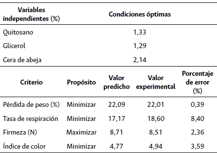 El nivel óptimo para las diferentes variables se logró con 1,33, 1,29 y 2,14 % para quitosano, glicerol y cera de abeja, respectivamente, con una deseabilidad global de 0,716. En general, para cada respuesta predicha, el porcentaje de error fue inferior al 10 % (Tabla 5).