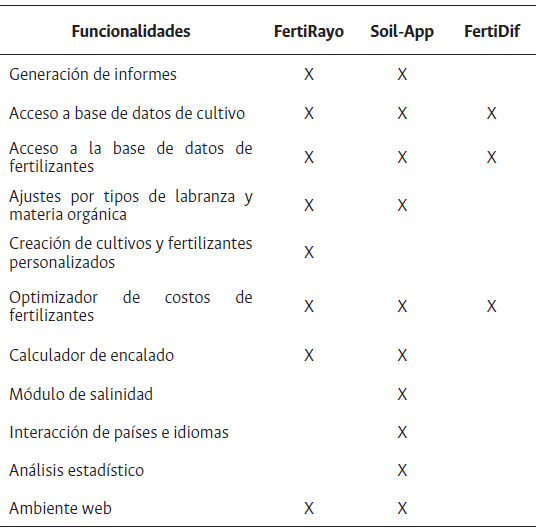 Fertidif es una herramienta eficiente en el contexto de la fertilización de las plantas. Los investigadores han obtenido resultados que demuestran la efectividad del software Fertidif y concluyen que esta herramienta tecnológica brinda información valiosa al agricultor para tomar decisiones acertadas (Niquín-Alayo et al., 2018). Por otro lado, Soil-App es otro software de código abierto que incluye la interpretación de pruebas de suelo, cálculo de enmiendas (cal y yeso), la tasa de fertilizante para los cultivos más importantes de Brasil, una calculadora de mezcla y evaluación de NPK, además de ofrecer análisis estadísticos (Matías et al., 2020).