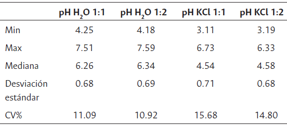 El análisis descriptivo se ilustra en la Tabla 1, donde se observa que para los tratamientos de agua destilada los valores oscilan entre extremadamente ácidos hasta neutros, mientras que para el caso de los tratamientos con KCl los valores de pH están entre extremadamente ácidos y ligeramente ácidos, según la clasificación planteada por Centro de Investigaciones del Banano (Cenibanano, 2022) y Osorio (2018). El coeficiente de variación para las mediciones de pH KCl 1:1 se clasifica como bajo (15 % - 30 %), mientras que para las demás disoluciones, así como las realizadas en agua, se clasifican como muy bajo (0 % -15 %), con base en la clasificación del coeficiente de variación para variables de suelo presentado por Larreal et al. (2009). Esto nos indica que existe una buena reproducibilidad de las medidas y, por consiguiente, que los métodos presentan altos niveles de confianza, resultados similares a los encontrados por Nel et al. (2022).