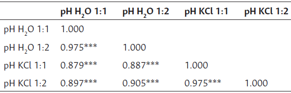 Por otro lado, no se encontraron diferencias significativas entre los radios de disolución en ninguna de las matrices de solución (p > 0.05). Resultados similares se encontraron en las investigaciones de Nel et al. (2022) y Rambwawasvika et al. (2021), en las que evaluaron relaciones entre 1:1 y 1:5 en suelos con diferentes características de Western Cape y suelos cultivados en caña de azúcar de Zimbabwe. Kabała et al. (2016) mencionan que las diferencias en los radios de solución no son representativas, en especial si se comparan con la variabilidad espacial que presenta el pH en el suelo.