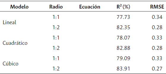 Así mismo, se evidenció que el mejor ajuste se presentó mediante una regresión polinómica de tercer grado (cúbico) para las mediciones en radio 1:2 con un valor de R2 =83.91 % y RMSE= 0.27, lo que indica una menor dispersión de los datos (Figura 2). Estos resultados son similares a los obtenidos por Khadka et al. (2021), que determinaron que un modelo cuadrático o cúbico para la estimación del pH en KCl presenta un buen ajuste. Adicionalmente, Wang et al. (2019) para la zona de Guangxi en China, mediante una regresión cuadrática, obtuvieron un R2=83.6 %. Se observa que la precisión del modelo aumenta con el incremento del radio de disolución, tal como lo mencionan Kome et al. (2018).