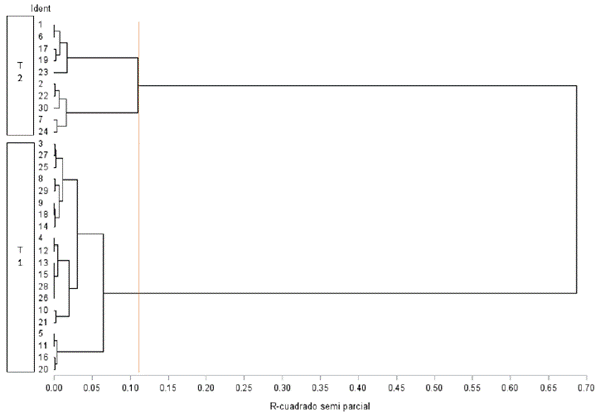 El análisis de conglomerados permitió identificar dos tipos de AGESBDP (Figura 1), que se denominaron AGESBDP T1 y AGESBDP T2. Los AGESBDP T1 representaron el 66.66 % y los AGESBDP T2 el 33.34 %. En la Tabla 2, se presentan la estadística descriptiva de las variables evaluadas según al agrupamiento de los AGESBDP.