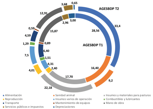 Así mismo, el costo de producción de leche fue menor en AGESBDP T1, debido a los gastos operacionales e inversión diferenciados con AGESBDP T2, condiciones resaltadas por Holmann et al. (2004). La distribución porcentual de los costos variables y fijos, que influyeron en los costos de producción (Figura 2), mostró que la alimentación tuvo la mayor participación, seguida de los insumos para pastizales y la mano de obra. Además, AGESBDP T1 registró un mayor porcentaje en costos sanitarios.
