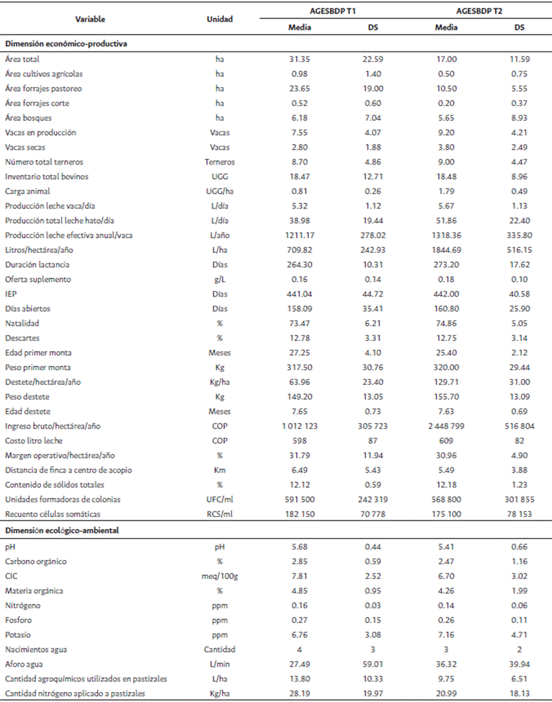 Tabla 2: Estadística descriptiva de las variables medidas en los agroecosistemas de producción bovina doble-propósito, tipificados desde las dimensiones económicas, productivas, ecológicas y ambientales (AGESBDP T1 y AGESBDP T2)