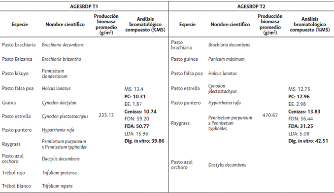 Tabla 3: Gramíneas predominantes, producción de biomasa y composición nutricional, en los agroecosistemas de producción bovina doble-propósito, tipificados en la subcuenca del río San Marcos (Tuluá, Valle del Cauca)
