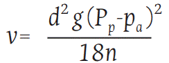 Donde v es la velocidad de sedimentación (cm/ seg); d es el diámetro de las partículas (cm); g es la aceleración de gravedad (cm/seg2); ρp y ρa son las densidades de las partículas sólidas y del líquido o agua, respectivamente (g/cm3); y η es la viscosidad del fluido (poise).