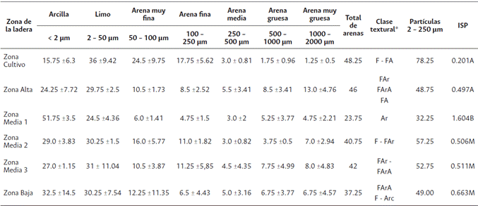 Ar= arcillosa; F= franca; FAr= franco-arcillosa; FArA=franco-arcillo-arenosa; FA= franco-arenosa; ArL= arcillo-limosa. A: alto; M: moderado; B: bajo. ISP: índice de separabilidad de partículas. *De acuerdo con la clasificación de USDA (2017).