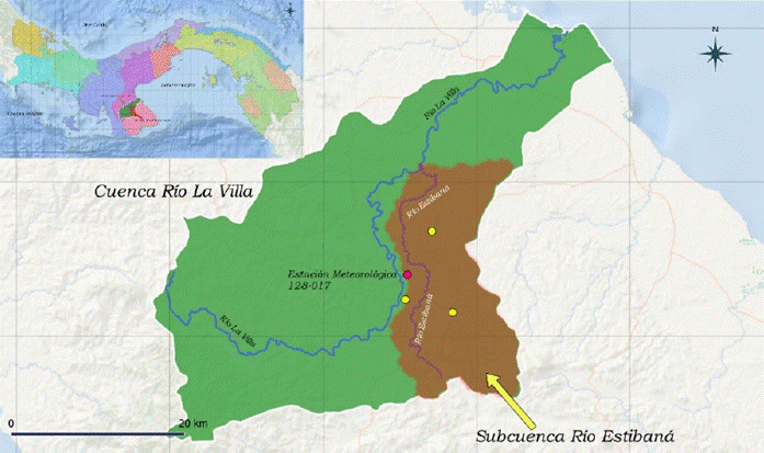 El ensayo se realizó en la subcuenca río Estibaná ubicado en la península de Azuero, provincia de Los Santos, Panamá, durante la época lluviosa de 2020 y 2021 (Figura 1). Esta es una zona intervenida por fuentes antrópicas, y las actividades principales son las explotaciones agropecuarias, que presentan una tasa elevada de deforestación, lo que la hace susceptible al efecto erosivo de las precipitaciones. La subcuenca tiene un área de 197.0 km2 en la zona central de la península de Azuero (ANAM, 2013). Los suelos dentro de la subcuenca pertenecen al orden Inceptisol, formados por depósitos fluviales y suelos residuales (IDIAP, 2010). Los suelos evaluados dentro de la subcuenca, según el análisis de textura, están clasificados como suelos franco-arcillosos, lo que los hace suelos con una infiltración de media-baja, retención de agua de media-alta y una susceptibilidad a la erosión de media-alta.