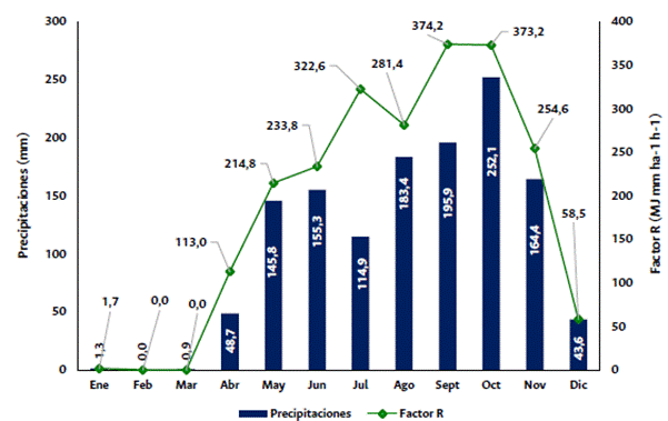 La evaluación de los datos climáticos generados por la estación 128-017 para el periodo 2010-2020 arrojaron un promedio anual de precipitación de 1306.40 mm, los cuales presentaron una distribución irregular a lo largo de año. En la Figura 2 se muestra la precipitación promedio mensual y el valor calculado del factor R.