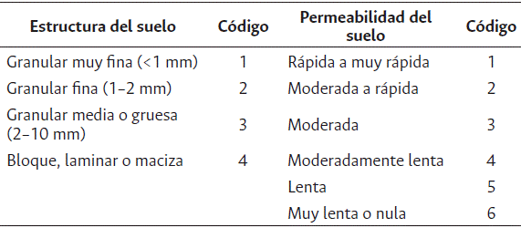 Su determinación se efectuó mediante la observación y el tacto, asignando valores de 1-4. En la Tabla 1 se presentan las categorías y códigos empleados de acuerdo con la USLE.