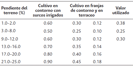 Los valores calculados del factor P (Tabla 3) para las pendientes evaluadas oscilaron entre 0.25- 1.00; entre más cercano el valor de P a 1.0, menor fue el efecto de las prácticas de conservación sobre la pérdida de suelo.