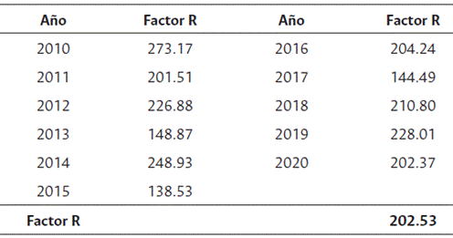 La Tabla 4 muestra los valores del factor R para cada año evaluado (2010 - 2020). El valor promedio del factor para el periodo estudiado fue de 202.23 MJ mm ha-1 h-1.