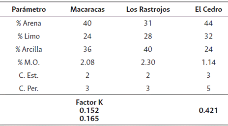 El valor K se expresa en unidades inglesas, por lo que se multiplicó por el factor de conversión 1.317 para convertir los datos al sistema internacional (SI); el factor se representa en t ha h ha-1 MJ-1 mm-1, que expresa la resistencia del suelo en superficie y tiempo respecto a la energía de la lluvia. Es importante mencionar que esta ecuación solo es válida para suelos que poseen una fracción limosa menor al 70 %.
