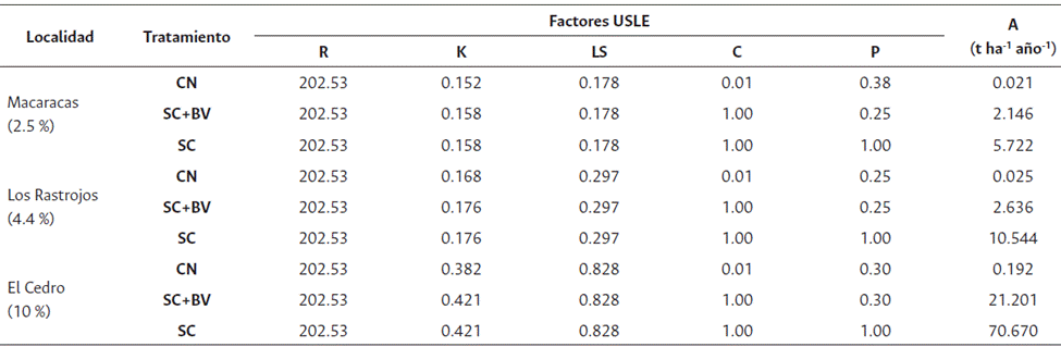 Cuando se evaluó un tratamiento sin coberturas más uso de barrera viva (SC+BV) en las localidades de Macaracas y Los Rastrojos se determinó que la pérdida seguía clasificándose como muy baja, ya que los valores reportados no superaron los 5.0 t ha-1 año-1, sin embargo, para pendientes mayores del 6 % se determinó que la pérdida de suelo fue de 21.20 t ha-1 año-1, lo que coloca a estos suelos en la categoría de erosión moderada (10.0-25.0 t ha-1 año-1) con procesos erosivos leves.