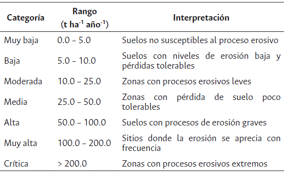 Se ha establecido el término tasa tolerable de pérdida de suelo (T2), cuya definición resulta compleja; con el paso del tiempo esta ha pasado por enfoques soportados en la fertilidad del suelo, en su profundidad o en consideraciones económicas. Sin embargo, en términos generales se toma la definición dada por Wischmeier (1976) que definió la T2 como el “máximo nivel de erosión del suelo que permite un elevado nivel de productividad del cultivo, sostenible económicamente e indefinidamente”. La tasa tolerable de pérdida de suelo se acepta en 11.0 t ha-1 año-1, por la proximidad de este valor a la tasa máxima de desarrollo del horizonte bajo condiciones óptimas (Peláez, 2003).