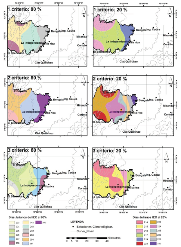 Figura 5: Distribución espacial de los 3 criterios al 80 y 20 % de probabilidad de no excedencia para la segunda época de crecimiento del arroz en el Valle del Cauca, Colombia. IEC. Inicio de la época de crecimiento.