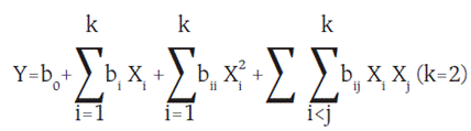 donde es la variable de respuesta, y son las variables independientes y y son los coeficientes de regresión: intercepto, lineal, cuadrático e interacción, respectivamente.