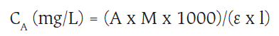 donde A = [(A515 - A700)pH 1 - (A515 - A700)pH 1 - (A515 - A700)pH 4,5], es la absorbancia de la disolución de trabajo; M = masa molar de C3G (449.2 g/mol); 1000 = factor de conversión de gramos a miligramos, ε = coeficiente de extinción molar de C3G (26 900 L x mol-1 x cm-1) y l = factor de corrección óptica (1.25 cm).