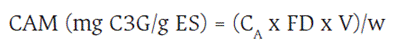 CAM (mg C3G/g ES) = (CA x FD x V)/w donde CAM = concentración de antocianinas monoméricas en la disolución de trabajo; FD = factor de dilución; V = volumen de la disolución patrón (L), y w = masa del extracto seco (g).
