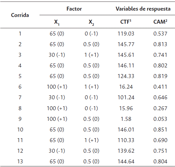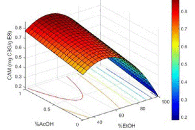 Se realizó un proceso de optimización de las condiciones de extracción (concentración de EtOH y AcOH) utilizando DCC. Los resultados de los experimentos del DCC se muestran en la Tabla 1. Por otro lado, los resultados del ANOVA para el CTF se muestran en la Tabla 2. Y a su vez, los resultados del análisis mediante metodología de superficie de respuesta para el CTF y el CAM, se muestran en las Figuras 1 y 2, respectivamente.