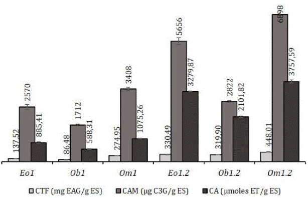Bajo las condiciones establecidas en el proceso de optimización se prepararon extractos a partir de los frutos de Eo, Ob y Om. Los extractos obtenidos se sometieron a purificación mediante cromatografía de columna empleando la resina Diaion HP-20 como fase estacionaria, con el propósito de obtener fracciones más ricas en compuestos fenólicos. En la Figura 3 se presentan los valores de CTF, CAM y CA obtenidos para los extractos Eo1, Ob1 y Om1, así como para las fracciones purificadas Eo1.2, Ob1.2 y Om1.2 de E. oleracea, O. bataua y O. mapora, respectivamente. Las fracciones correspondientes a Eo1.1, Ob1.1 y Om1.1 no mostraron valores significativos de CTF, CAM y CA, por tal razón no se reportan esos datos.