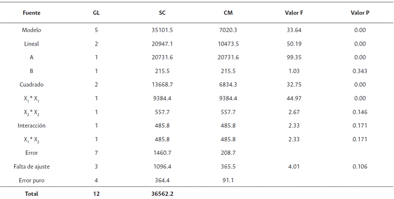 Los datos de la Tabla 2 permiten establecer que el efecto lineal y cuadrático de la concentración de EtOH presenta una influencia significativa (valor - p < 0.05) sobre el CTF. Por su parte, para el %AcOH, en estos mismos términos (lineal y cuadrático) y para la interacción entre el %EtOH y el %AcOH, no se generan diferencias significativas (valor - p > 0.05). Sin embargo, a diferencia de lo ocurrido en el rendimiento de extracción, el valor - p obtenido para la falta de ajuste (0.106) fue mayor al nivel de significancia (0.05), lo que indica que el modelo usado () describe correctamente la relación entre los factores de operación y el contenido total de fenoles.