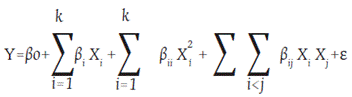 Donde y es la variable respuesta, βo es el coeficiente de interacción, βij Xi y Xj son las variables independientes, βi βii βij son los coeficientes respectivamente para términos lineales, cuadráticos y su combinación, mientras que ε representa el error experimental aleatorio.